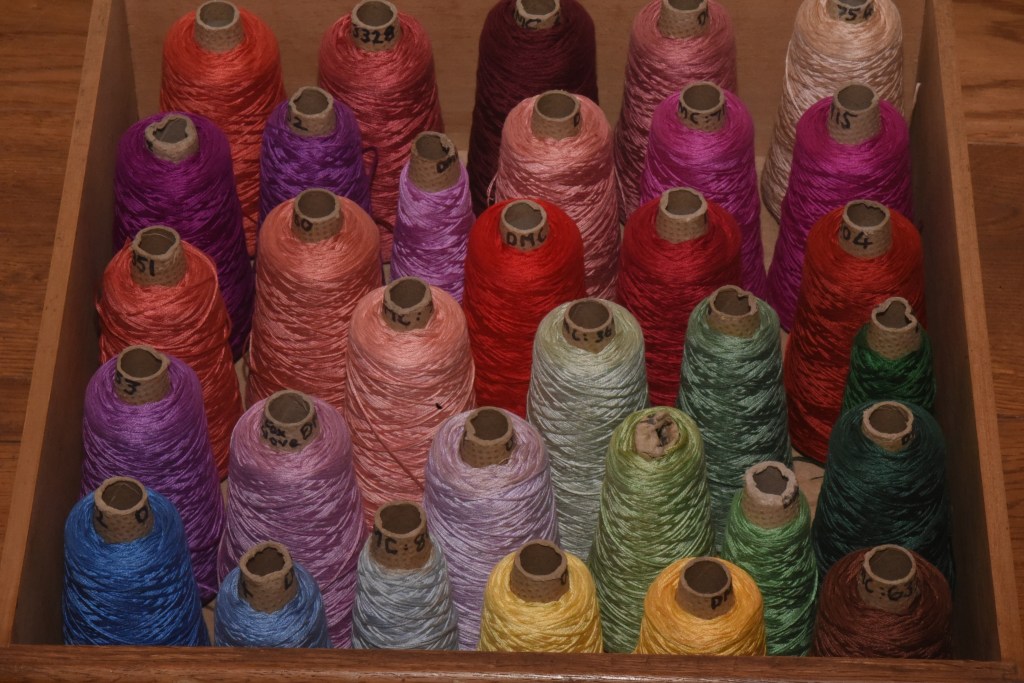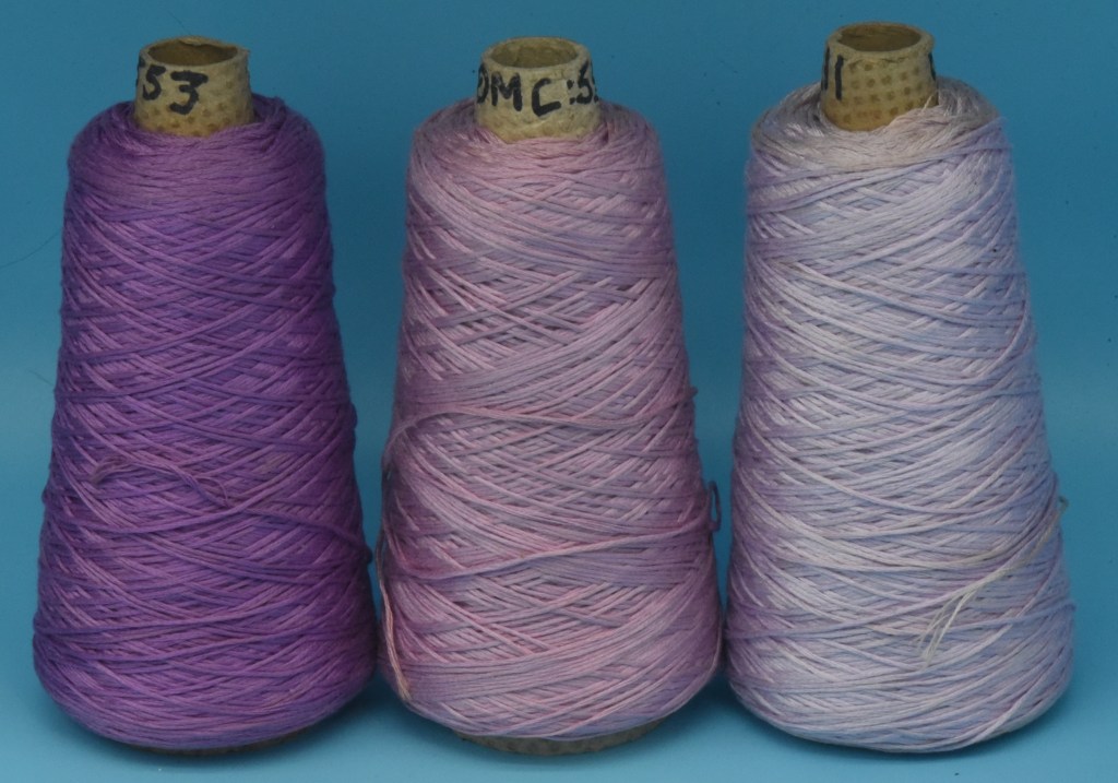 We also have available sets of three greens, reds, pinks, blues etc. A set of three cones costs £35 which is a huge saving on buying individual Anchor skeins. These cones are therefore ideal for Sewing Clubs, Crafting Groups or small Embroidery Businesses who want to take advantage of buying by the cone rather than small skeins at retail prices. All the thread is in good condition and ready to sew.